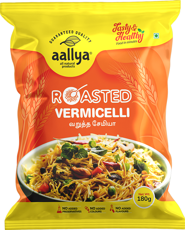 Roasted vermicelli is a traditional delicacy, extruded from hard wheat flour and roasted to perfection to enhance the flavor. Vermicelli is a widely used ingredient in Indian kitchens due to its high affordability and versatility. Its major nutrient is carbohydrates, so vermicelli made from refined or whole wheat flour can provide energy. A vermicelli breakfast like upma is a superb way to boost energy during the workday. Many Indian dishes use vermicelli, such as upma, falooda, kheer, Curd Semiya, payasam, and other hot and sweet dishes
